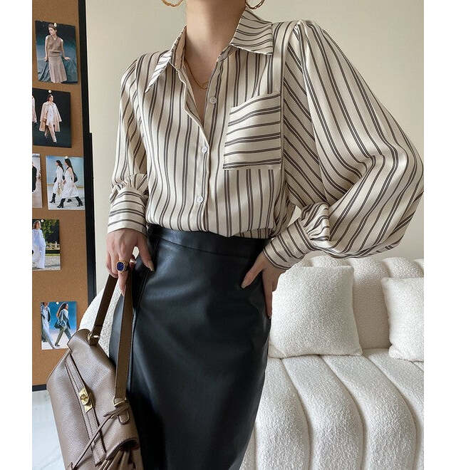 ほんのりツヤ感のある生地に、優しいトーンのストライプが女性らしさを引き立てる一枚です。レザー調スカートでモードにまとめても、浮かないのがこのカラーの魅力的。