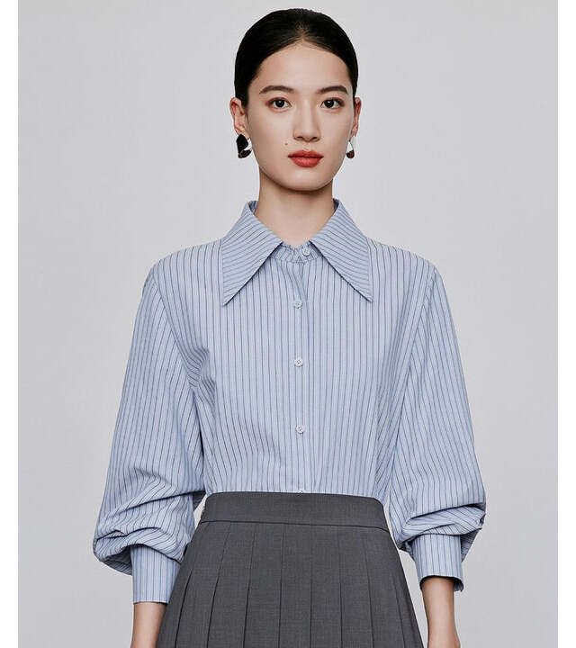 シャープなブルーにタック入りの立体フォルムが魅力的。ワイドカラーが顔周りをすっきり見せつつ、クラシックな印象も演出してくれます。グレーパンツやタイトスカートとの相性抜群です。