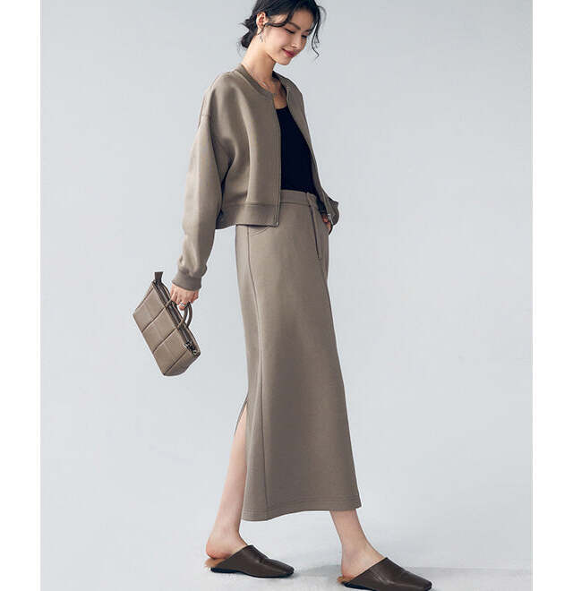 ジッパーの開け方でシルエットに変化をつけつつ、スリムなマキシスカート×ブーツ×ひとクセバッグで、シックで洗練された秋コーデが完成。
