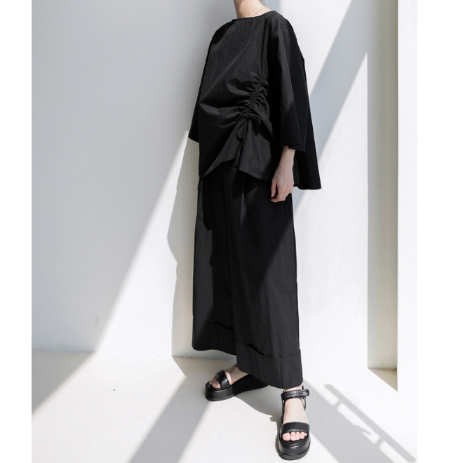 周りと被らない存在感を放つのが、アシメトリーに寄せられたドローストリングデザイン。絞り加減次第でシルエットが変わり、1枚で何通りもの表情を楽しめる。ゆるっとしたシルエットながらも、コットン100%のパリッとした生地感のおかげで、ラフに見えないのも嬉しいポイント。