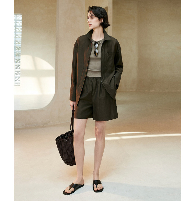 ワードローブに欠かせないオーバーシャツ。ダブルジッパー仕様ならベーシックさにエッジが加わり、いつもの着こなしを格上げしてくれる一枚!リネン混のしっかりとした質感とコーヒーブラウンの深みで、大人の落ち着きもプラス。