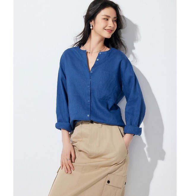 ラウンドネックとシンプルなディテールの洗練されたデザインで、シンプルなのに非常に大人っぽい雰囲気のラウンドネックシャツ。リネンのさらっとした風合いは視覚的にも目立つので、きちんと感がありつつも、カジュアルダウンして普段使いしやすくなります。ロイヤルブルーの色味がアクセントです。