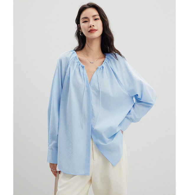 ひもやリボンなどのコードでぎゅっとしぼませたようなデザインのドローストリングという技法を使ったシンプルブラウス。爽やかな印象のあるブルーカラーが、コーディネートのアクセントになってくれます。シンプルで洗練された印象のブラウスに、上級者向けのおしゃれテクを入れ込んだデザインです。