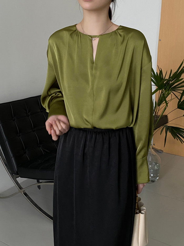 マッドな生地感なのに陰影がはっきり出るので、高級感溢れるマッド素材に見せてくれるブラウス。派手なディテールは無いシンプルなデザインですが、深みのあるグリーンと胸元の小さい空きがうまくコントラストを出して、ヘルシー印象にしてくれるのです。ドレープ感がとても綺麗ですよね。