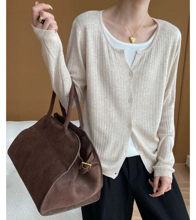 季節の変わり目に大活躍する薄手リブカーディガン。さらりと羽織れる軽やかさが魅力で、ベージュならどんなコーデにも自然と馴染みます。シンプルなのにおしゃれ見えする万能アイテムです。