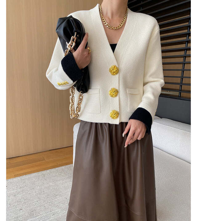 ニットほど起毛しておらずすっきりと、でもスーツ生地よりはしっとりと暖かく。ポリアミド繊維を使用した独特な素材感にセンスが光るカーディガン。大きなゴールドボタンをあしらうことで、ラグジュアリーな1枚に。ジャケットに劣らずの貫禄と存在感を備えています。