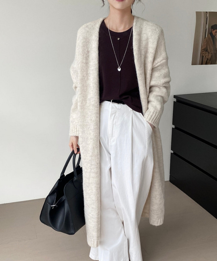 長めの丈がアウター感を醸し出すカーディガン。分量は多くても、モヘヤのような柔らかな素材感とオフホワイトの淡い色味が重たく見せない。フロントオープンタイプでショールをかけるように軽く羽織れるのも嬉しいですね。さりげない秋コーデがこなれて見えます。