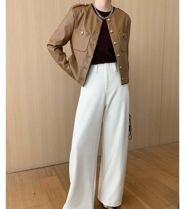 カラーバリエーションも豊富なここ最近のレザーアイテム。定番のブラックやブラウンに重さを感じたら、思い切って明るい色を試してみて。こちらはノーカラー、短めの丈などデザインも軽やかですね。ホワイトのパンツを合わせれば高級感のある着こなしに。