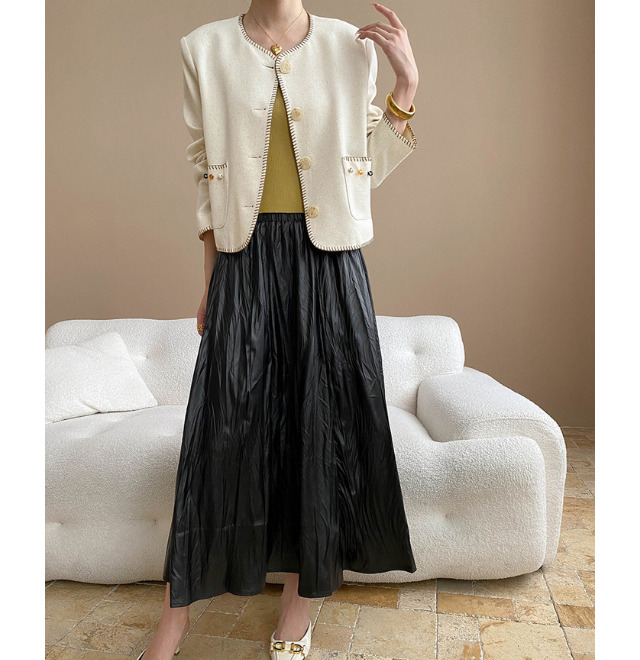 レザー自体にシワ加工やプリーツを施し、エレガントに仕上げたスカート。フレアスカートのような感覚で穿け、レザー初心者さんにも着やすい1枚。レザーのハンサムな部分も魅せたいからトップスにはきちんとめのジャケットで。フェミニンな中にいい緊張感が漂います。