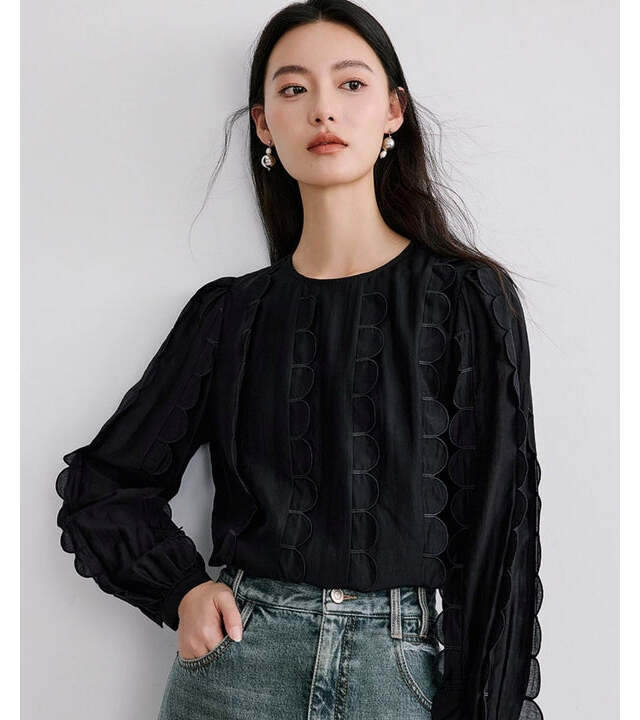 立体的なスカラップラインが目を引くブラウス。縦のラインを強調してくれるから、スタイルアップ効果も抜群。さらっとしたシフォン素材で着心地も軽やか。いつものデニムに合わせるだけで、こなれ感アップ。