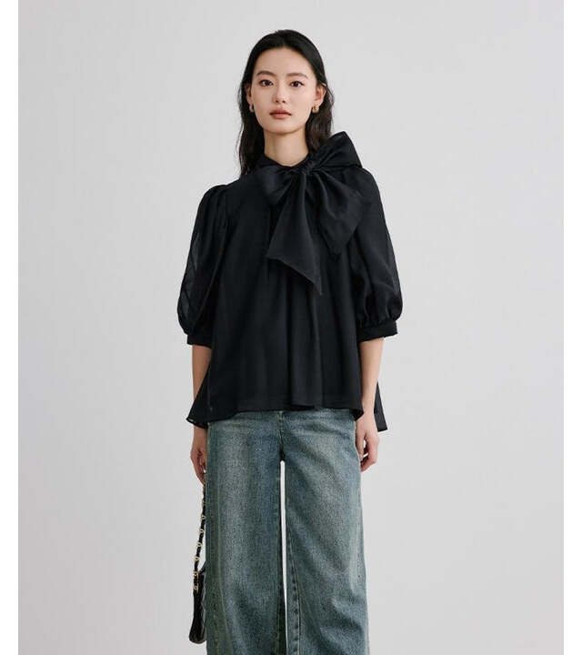 大胆なリボンディテールが印象的な主役級ブラウス。ボリュームスリーブとのバランスが絶妙で、大人の可愛さをしっかりキープ。黒だから甘すぎず、きちんと感も演出。1枚で華やかに見せたい日にぴったり。