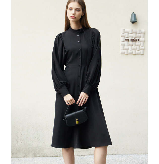 抜け感たっぷりのシャツデザインが魅力。少し光沢のあるブラックが大人の余裕を感じさせます。前を開けて羽織り風にも着られて、1着で着こなしの幅が広がる万能アイテム。