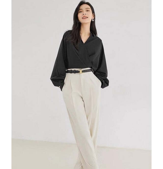 シンプルな中に洗練されたニュアンスが光る一枚。ボリューム袖とVネックで抜け感たっぷり、大人の余裕を演出。ベージュパンツと合わせれば、一気に秋の都会的モードコーデが完成。