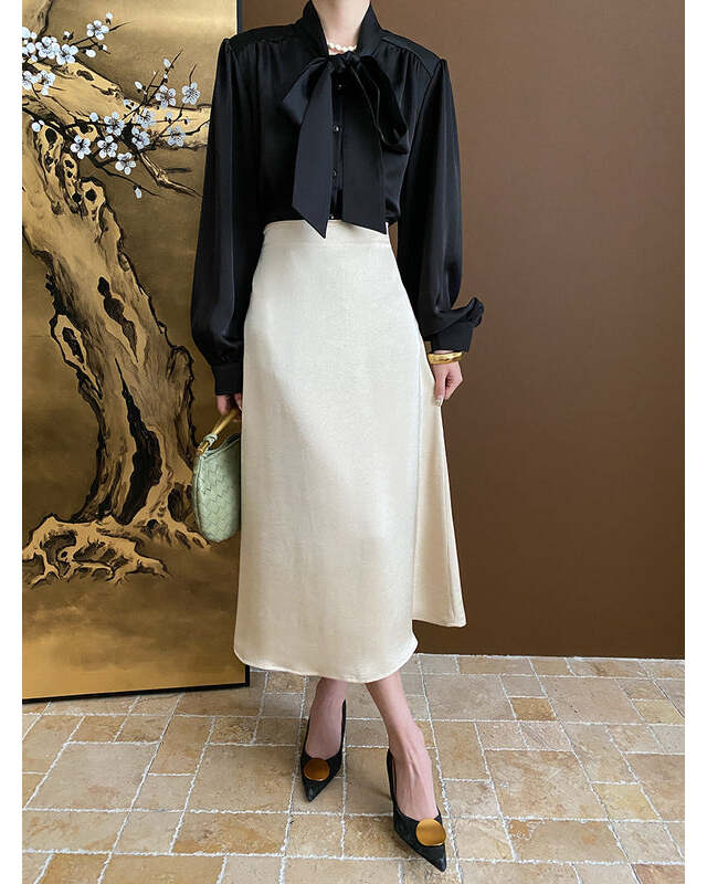 ドラマティックなボウタイリボンが視線を集めるドレープブラウス。やや光沢のある素材で上品な印象に。アイボリーのフレアスカートと合わせて、秋のお食事会やお呼ばれにもぴったりな華やかコーデに。