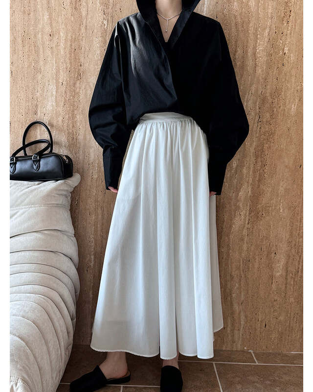 個性派シャツは、ディープVネックでこなれた印象に。ふんわりとした白スカートと合わせれば、シックながらも柔らかさのある秋スタイルに。人とかぶらないコーデを楽しみたい人におすすめ。