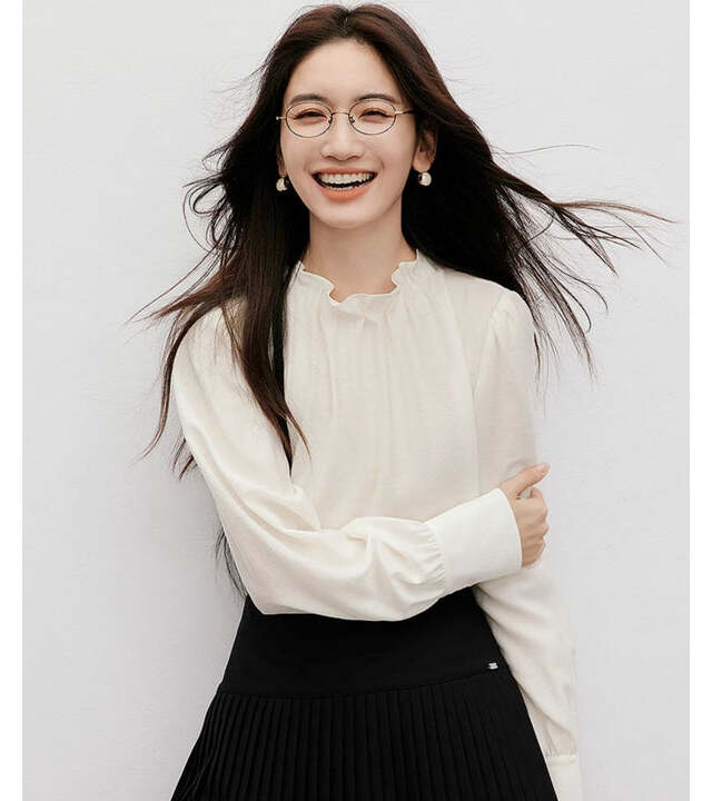 ふわっと立ち上がるネックラインと、袖口のギャザーがポイントのクラシカルな一着。甘すぎず洗練された雰囲気で、ジャケットインにもおすすめ。スカートで合わせて上品にまとめてみましょう。