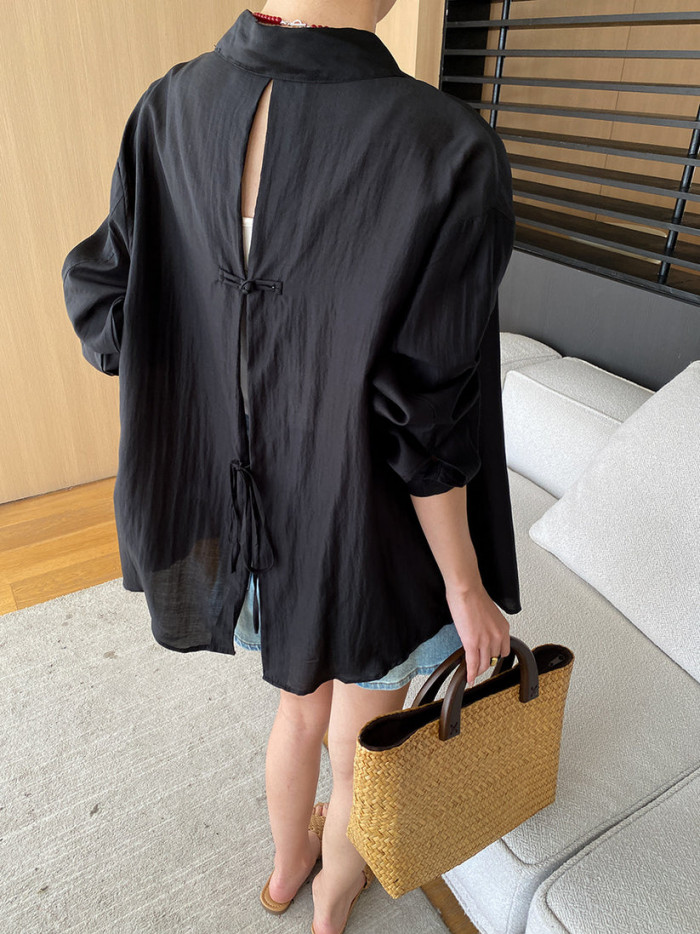 シャツのディテールで、かっちり過ぎずカジュアルすぎない程よいデザイン感が大人女子さんにも嬉しいシアーシャツ。フロントデザインはシンプルですが、バックデザインは大きなスリットとリボンがついているので、シンプルなのにコーディネートの中にアクセントをつられる優秀アイテムなのです。