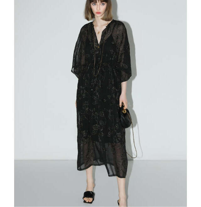 ブラックカラーのシアー生地×きらきら糸を用いた刺繍を全体に施した、繊細で儚げな雰囲気のワンピース。シルエット自体はシンプルですが、あまりメリハリや変化が無いので、体を覆い隠してボディラインを隠してくれるので、さりげなく体型カバーができます。シアー素材で、抜け感が演出できます。