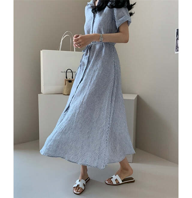 爽やかなブルーストライプが映える「コットンリネンシャツワンピース」で大人の涼感フェミニンスタイル