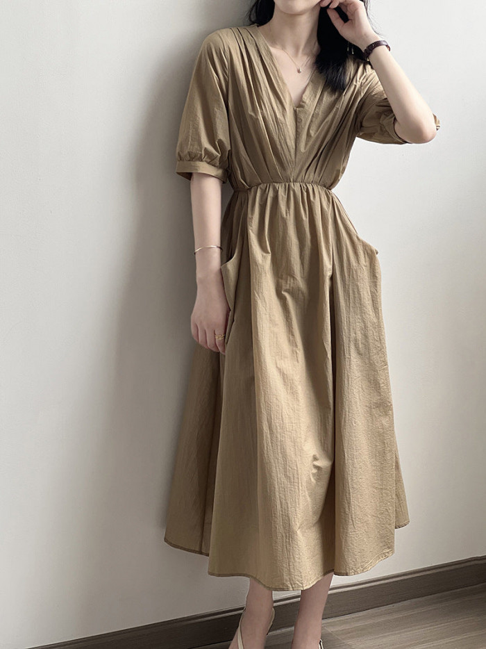 Xラインのシルエットで女性らしさを強調しつつ、カーキカラーの渋みのある色味で大人っぽい雰囲気にしてくれるワンピース。余計なパーツはなく、あえて生地感だけで勝負をしているのでシンプルなのにフェミニンに見えます。全体にドレープが広がるので、普段使いしやすくなりつつもエレガントさも忘れません。
