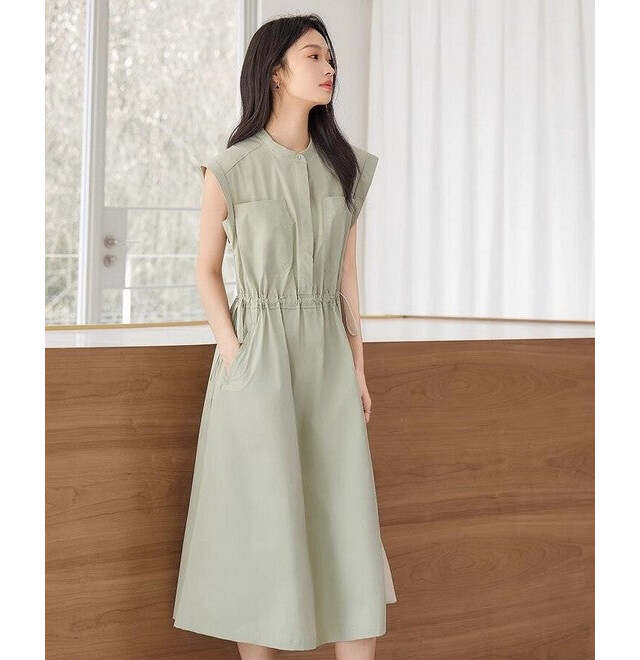 シンプルなデザインとシンプルなディテール、シンプルなほっそりとしたシルエットがミニマムで洗練された印象にしてくれるワンピース。淡いグリーンの色味が、清潔感を与えてより洗練されたイメージにしてくれます。ノースリーブなので、これからの時期はレイヤードアイテムとして活躍します。