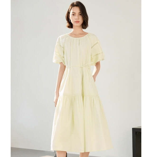浅く広く開いたラウンドネックの襟デザインやスリーブのカットアウトデザインが、ボリューミーなパーツとメリハリをつけてくれるワンピース。ふんわり可愛らしいフォルムや淡いイエローの色味で甘い雰囲気もありますが、すっきり感があるだけで大人っぽく見えますよね。スニーカーを合わせても違和感はありません。