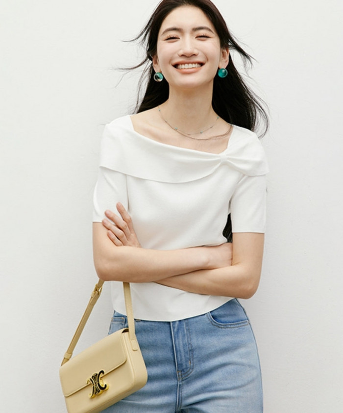 襟デザインがリボンディテールのワンショルダーになっているのが、非常に可愛らしく女性らしい印象を与えてくれるデザイントップス。ホワイトの色味であるからこそ、フレッシュでおしゃれな雰囲気になるのです。これからの季節に羽織りものを羽織りやすいぐらいのサイズ感で、まだ着回せます。