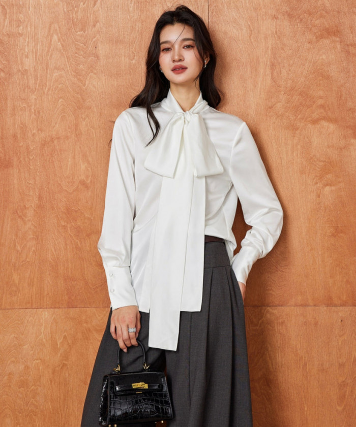 大きめのリボンタイにはホワイトでしょ。リボンタイブラウス
