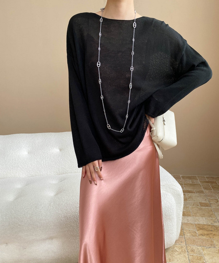 これからの時期にぴったりのルーズニット。オーバーサイズ感がおしゃれです。ロングネックレスをプラスして、エレガントな雰囲気に。