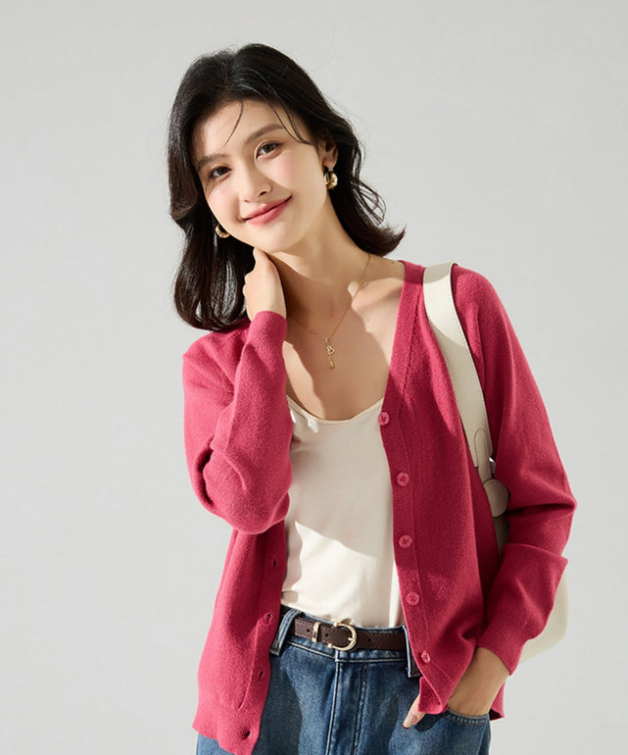 鮮やかなラズベリーカラーのニットカーディガン。シンプルなデザインなので、着回し力抜群です。薄手のトップスに羽織れば、これからの肌寒い季節にぴったり。