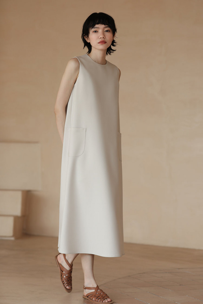 無駄を削ぎ落としたストレートラインが魅力のミニマルワンピース。大きめポケットがさりげないアクセントとなりモード感と実用性を兼ね備えた一枚。クリーンなホワイトが着る人の表情を明るくしアクセサリー次第でカジュアルにもフォーマルにもシフト可能。余計な装飾を必要とせず纏うだけで品の良さを演出。シンプルを極めたいあなたにこそふさわしい一枚。