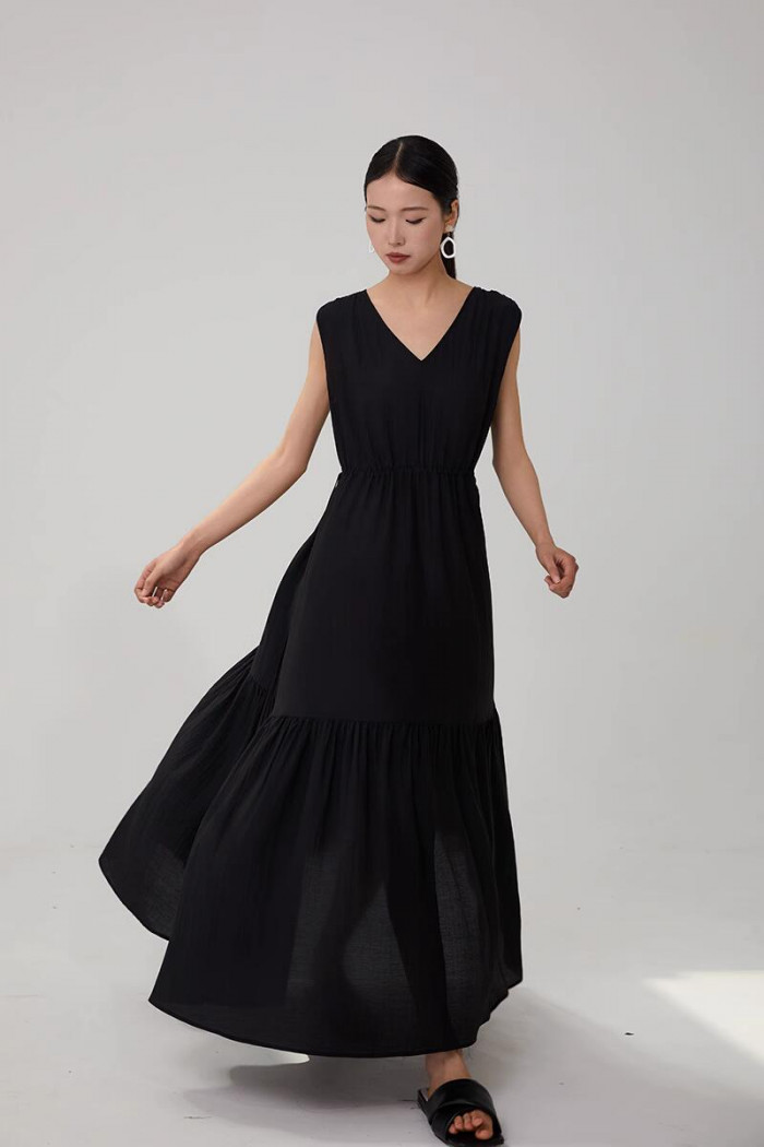 デコルテを美しく見せる深めのVネックにギャザーで揺れる裾が印象的なワンピース。動くたびに軽やかさをまとい女性らしさが自然に香る一枚。シンプルなデザインながら存在感は抜群でアクセサリーを最小限にしても華やかさをキープ。デイリーにも特別なお出かけにも使える万能ワンピース。あなたの一日をドラマティックに彩ってくれる存在。