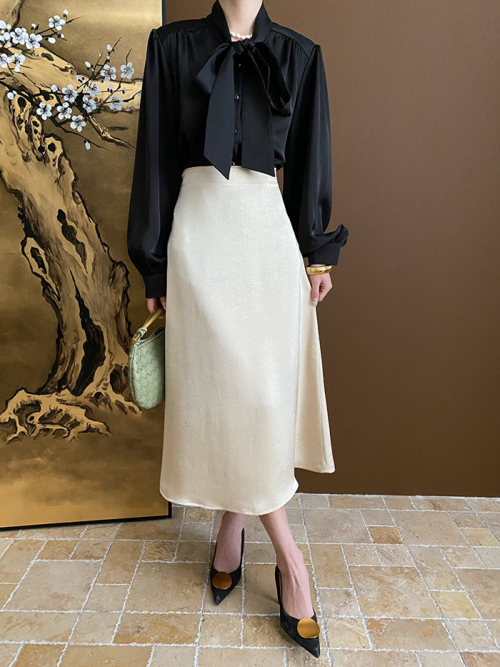 存在感のあるブラックのボウタイブラウスに光沢感のあるホワイトスカートを合わせたクラシカルな着こなし。上下のコントラストが生む華やかさと上品さが大人の余裕を感じさせる一枚。小物はあえてカラーを差すとモード感が引き立つ。レストランやパーティーシーンにも映えるシンプルでいてドラマティックなコーディネート。