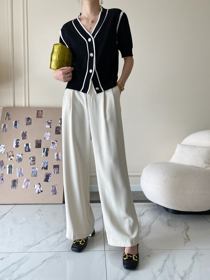 ブラックにホワイトのパイピングが効いたカーディガンを主役に軽やかなワイドパンツを合わせたモノトーンコーデ。ジャケットほど堅苦しくなく程よいきちんと感を備えた着こなしが魅力。鮮やかなバッグやシューズを合わせればシンプルながらぐっとおしゃれ度がアップ。オンにもオフにもマルチに対応する大人のための着回し自在なスタイル。