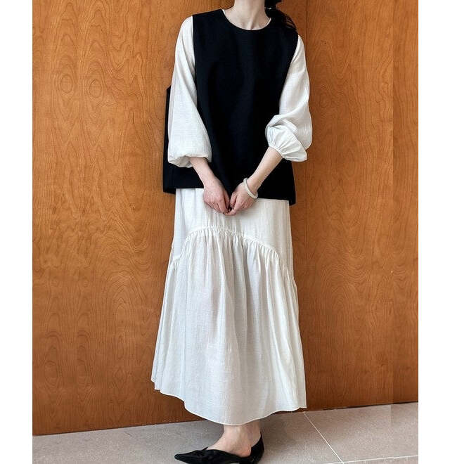 ブラックベスト風トップス×ホワイトティアードワンピース