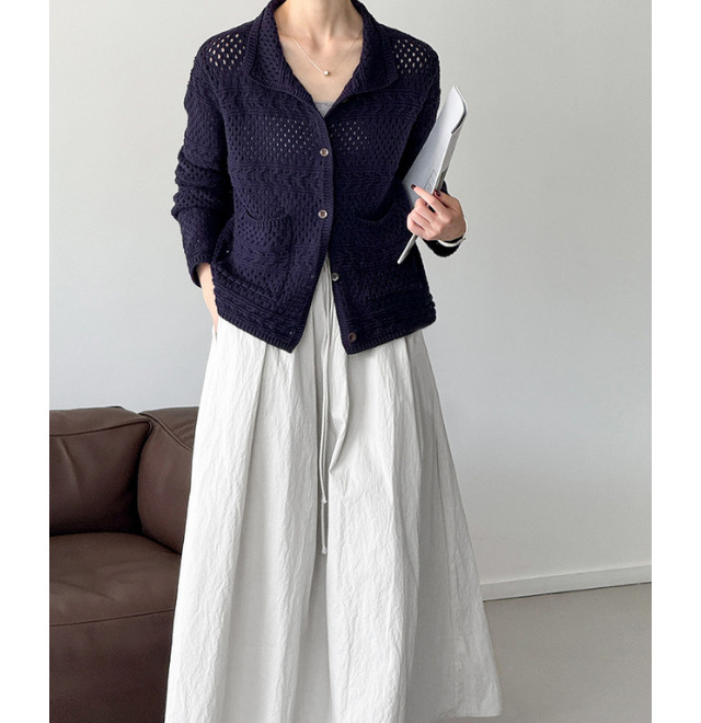 繊細な透かし編みが美しいネイビーのニットカーディガン。ジャケットのようなきちんと感がありながら柔らかな着心地で旅先でも大活躍。インナーにはシンプルなキャミソールを合わせてヘルシーな肌見せを楽しんで。ボトムスはふんわりと広がる白のロングスカートで軽やかさと女性らしさを演出。シックな色合わせで甘すぎない大人のリラックスコーデ。