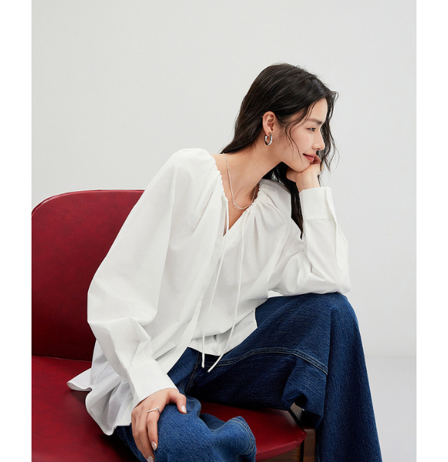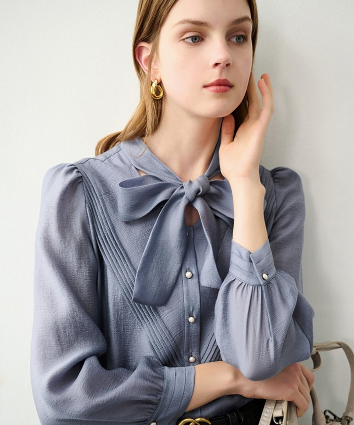 大きめのリボンとボリュームあるパフスリーブで、上半身に目を引くアクセントをプラス。ふんわりした袖のフォルムがデコルテや肩ラインをやわらかく包み込み、リボンの甘さで顔まわりが華やかに映えます。ボトムスをシンプルにまとめるだけでスタイルに“技あり”な華やかさを出せる、大人のコーデの主役になるブラウスです。