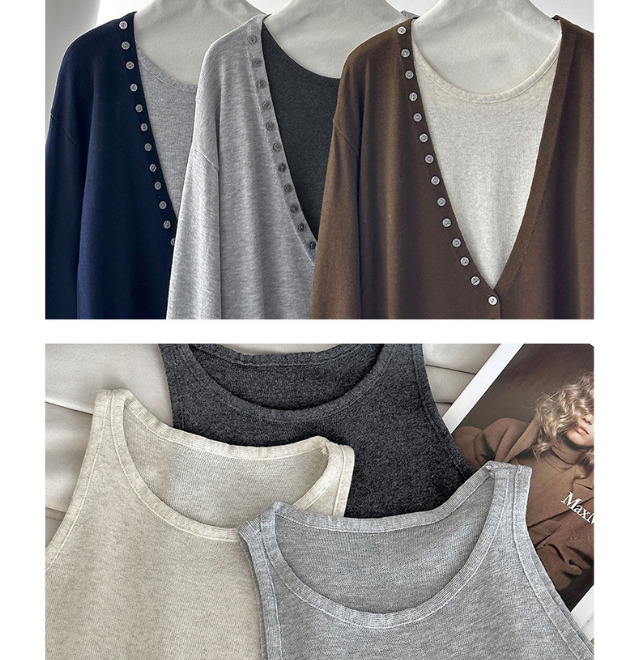 カーディガンとタンクトップのセットアップ。深いVネックにたくさんのボタンがアクセントのカーディガンと、ベーシックな形のタンクトップで、セットでも、単品でも使いやすいデザインです。