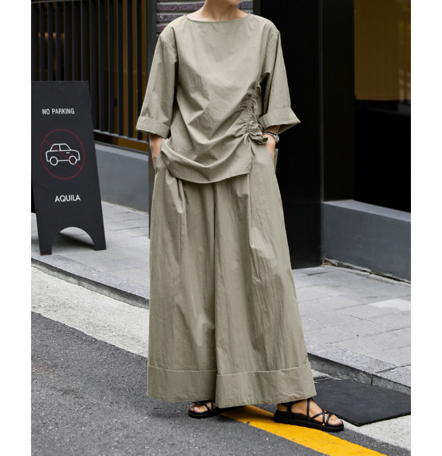 同じくゆるめのシルエットのボトムスを合わせてラフな着心地で上品コーデが完成する。