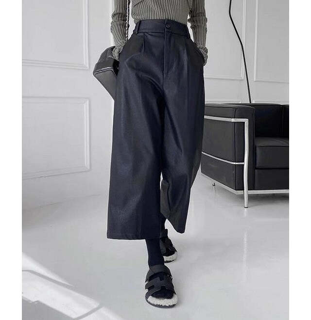 トレンド感のあるワイドシルエットにレザー素材を掛け合わせたパンツは、存在感たっぷり。ハイウエストデザインでスタイルアップ効果も抜群です。オーバーサイズのニットと合わせればリラックス感を演出でき、ジャケットを羽織れば一気にモードな装いに。大人の余裕を感じさせる一本です。