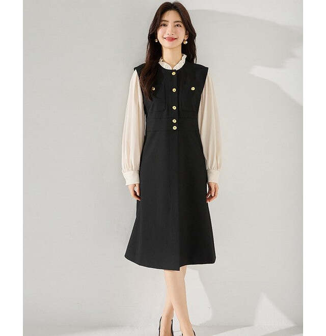 レースカラーが顔周りを華やかに見せてくれるワンピース。ツーピース風のデザインで上品なきちんと感があり、甘さとエレガンスを両立できます。ジャケットを合わせればオフィスにも使え、単品ならディナーやお出かけにもぴったりです。