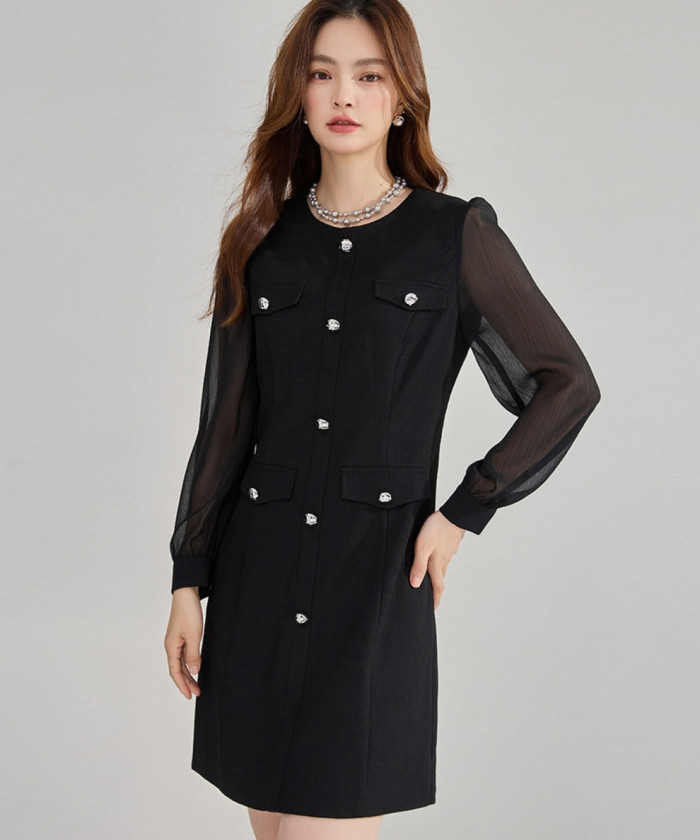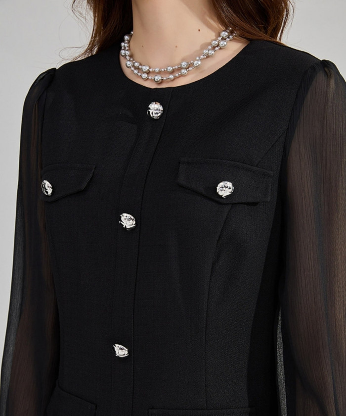 シフォン素材の袖がふんわりとした可愛さを演出しつつ、シルバーボタンが全体を引き締めるデザイン。コンパクトな丈感が若々しい印象を与えますが、モノトーンカラーで大人らしい上品さをキープ。甘さとシックさの絶妙なバランスを楽しめます。