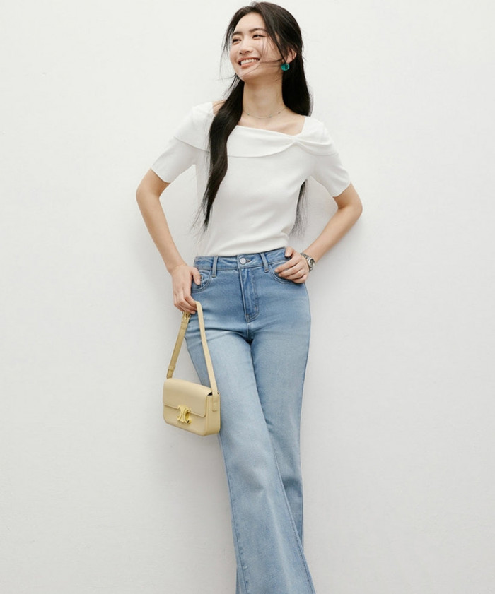 襟デザインがリボンの形となり、デコルテが綺麗に見えるトップス×カジュアルなジーンズを組み合わせたコーディネート。カジュアルさは強いですが、きちんと感やきれいめな感じも忘れないので大人っぽく、そして女性らしくジーンズに合わせられるのです。パンツスタイルが嬉しいママも多いのではないでしょうか?