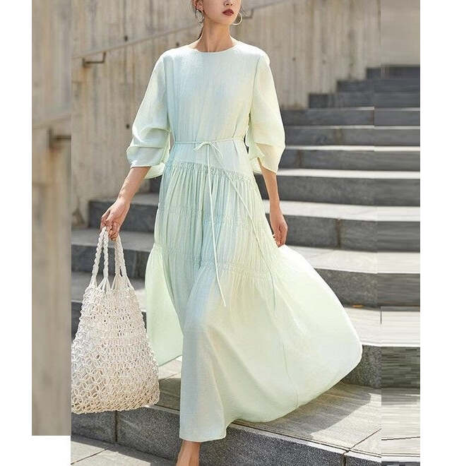 すっきりとしたラウンドネックやかっちりとしたディテールが全く入っていないデザインなのに、女性らしさは忘れない品のあるワンピースを使ったコーディネート。爽やかなグリーンのライトカラーが、カジュアルさと女性らしさをそれぞれ引き立ててくれます。ティアードのディテールが可愛らしいです。