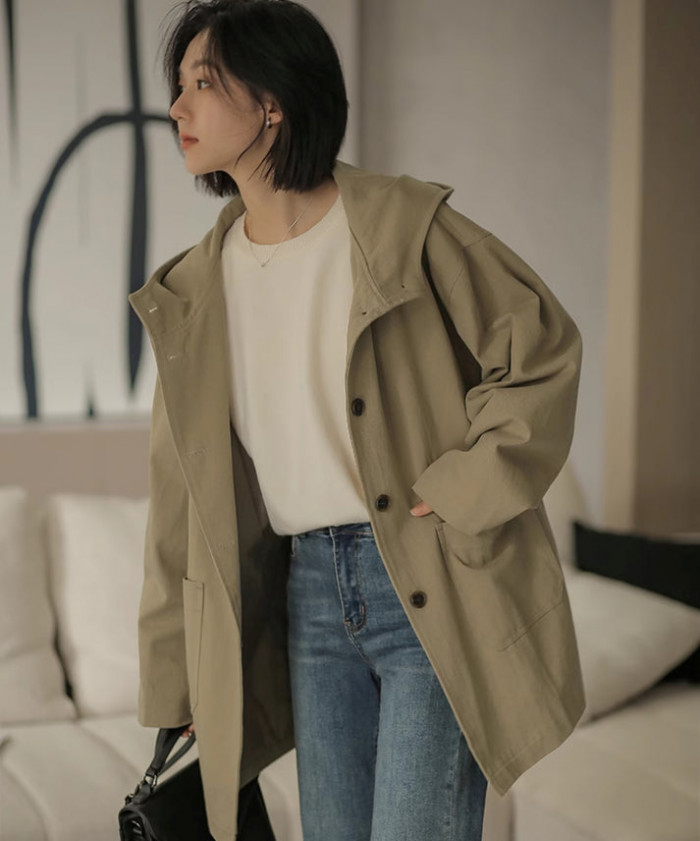 防水加工ではありませんが、スタンドカラーと一体化したフード付きで、突然の雨風でも安心です。
