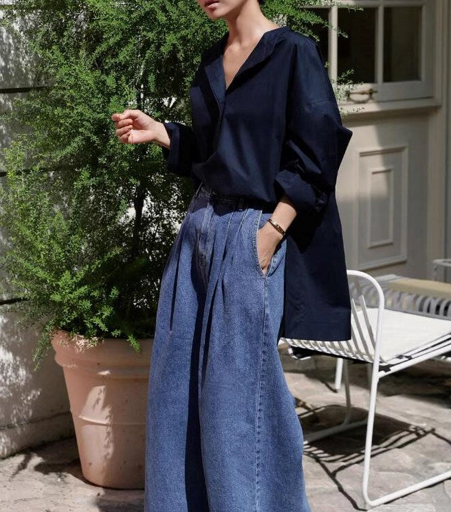 今季のトレンドの1つである「オーバーサイズシャツ」は、体型カバーをしたい方へ非常におすすめなアイテムです。ネイビーの色味でかっちりと締め上げつつも、ゆったりとしたサイズ感で大人っぽさは損なわず、ラフに着こなせるのが嬉しいです。開襟にして、デコルテもすっきり見せましょう。
