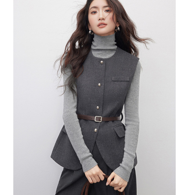 クラシックなグレーのノーカラーベストは、端正なシルエットと上質な素材感が魅力の一枚。フロントのボタンやポケットのディテールが洗練された印象を与え、シンプルでありながら存在感を放ちます。ジャケットとは異なる軽やかさを備えつつ、きちんと感をしっかり表現できるのも特徴です。