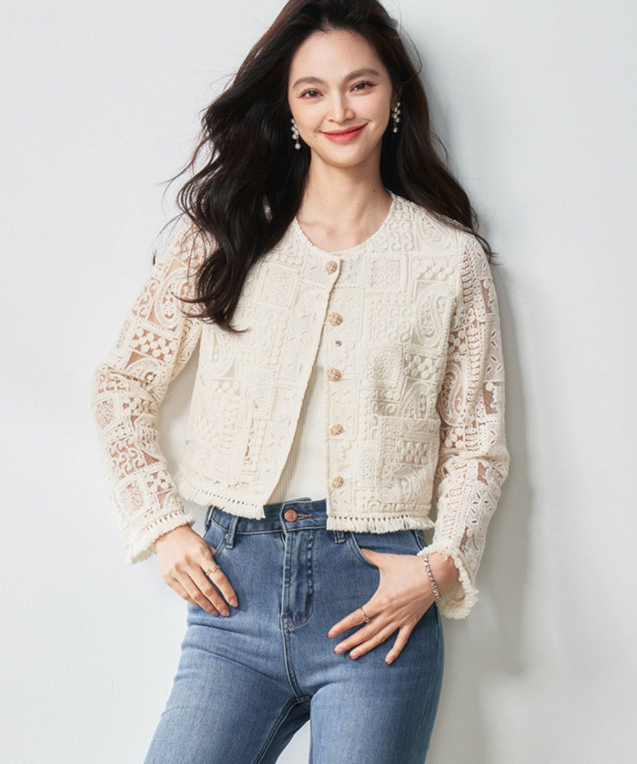 繊細なレースを贅沢にあしらったジャケット。立体的な模様が光を柔らかく反射し、上品な華やかさを演出します。フロントにはゴールド調のボタンを配し、クラシカルなアクセントに。透け感のあるスリーブが軽やかさをプラスし、爽やかな印象を与える一枚です。