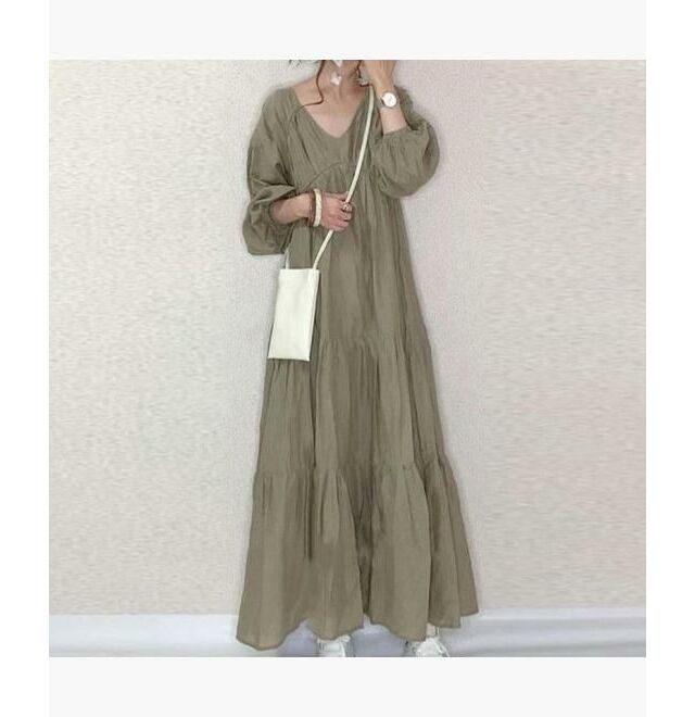 ゆるっとしたAラインシルエットのサイズ感が可愛らしく、さらにスカート部分には可愛らしいティアードのディテールが広がるワンピース。おうちの中でゆったり着るにはもったいないお出かけ服ですよね。秋らしい落ち着いたカーキカラーなので、ティアードが甘すぎずに機能するのは嬉しいですよね。
