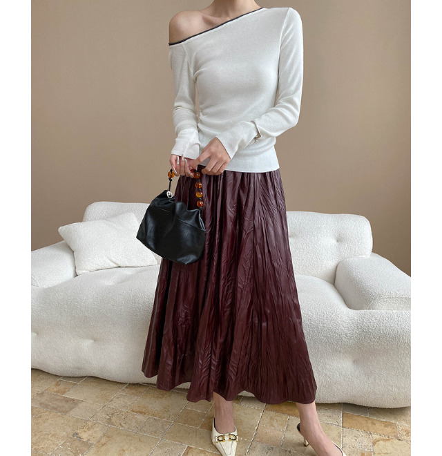 秋冬に欠かせないレザーは、今季「レディライク」にシフト。マルーンカラーのプリーツスカートを選べば、レザーのハードさとフェミニンさがいい塩梅に。